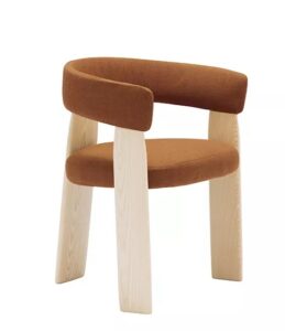 Poltrona com estrutura em madeira reciclada curva, em nogueira. opcionalmente com assento e encosto estofado em tecido ou couro.