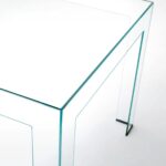 A mesa Atlantis, projetada por Lorenzo Arosio, está disponível em diferentes tamanhos, feita com colagem de placas de vidro de 8 mm. Temperada, cortada com jato de água e polida a 45°. Disponível em vidro transparente extraleve ou laqueado brilhante, em diferentes acabamentos. Transparente ou em outras 20 cores de laqueado.
