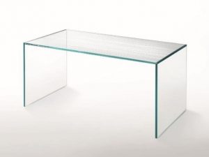Mesa elegante e simples, feita com uma única folha de vidro curvo extra clear transparente de 15 mm de espessura. As curvas graciosas e a atenção aos detalhes transmitem e enfatizam as qualidades intrínsecas do material.